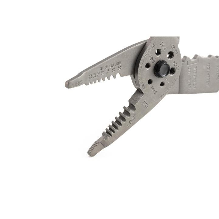 - All-purpose tool includes pliers type nose, crimper, wire cutter, stripper and bolt cutter