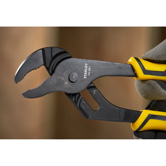 Engineered for durability, performance and superior grip, the next generation STANLEY® 250mm DYNAGRIP® Groove Joint Pliers is built for an extensive range of professional applications. These high quality pliers are ideal for gripping, clamping, loosening and tightening nuts, bolts and other fasteners. Constructed from drop-forged steel for strength and durability these robust pliers have been treated with a black oxide finish for help resisting corrosion and extended product life. The bi-material Three-Zone handle incorporates a guard zone for keeping your fingers from slipping forward, along with a strength zone to know where to apply force and a control zone to aid in opening the pliers, delivering control, grip and comfort in use – with minimum risk of fatigue.